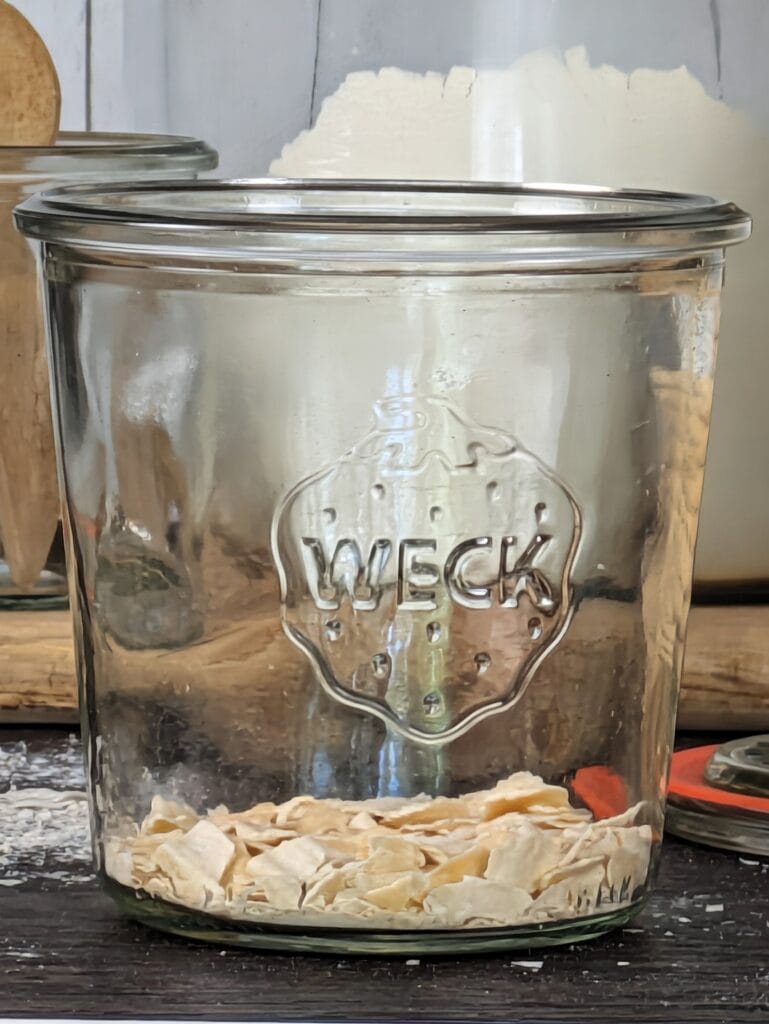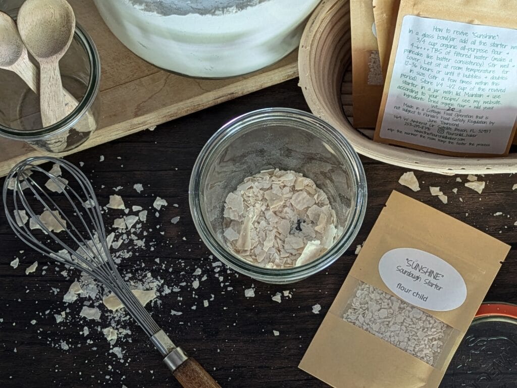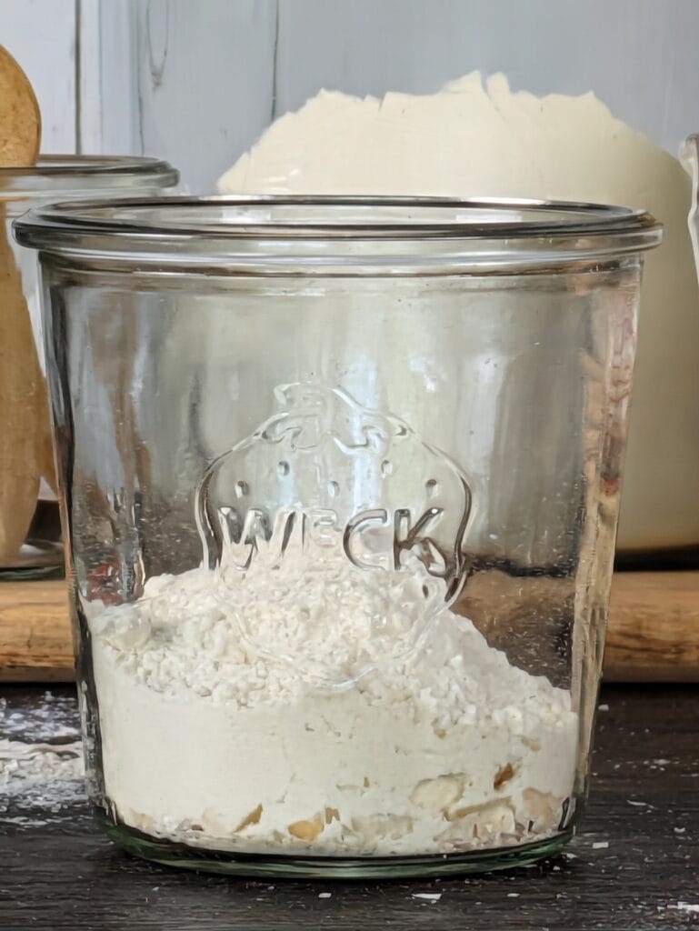 Add all the dehydrated starter to a glass jar (1/2 quart size is plenty) with 1/2 cup of organic all-purpose flour.