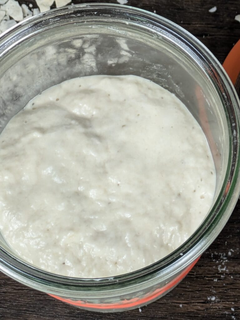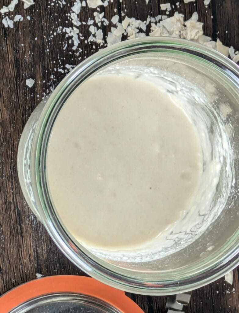 To the jar add 4-6 tablespoons (or more) of room temperature filtered/pure water. Add enough water to make a pancake to cake-like batter consistency (not too thick or thin). Stir well.