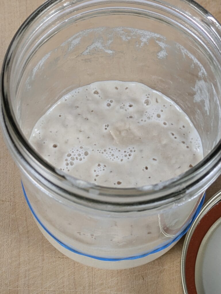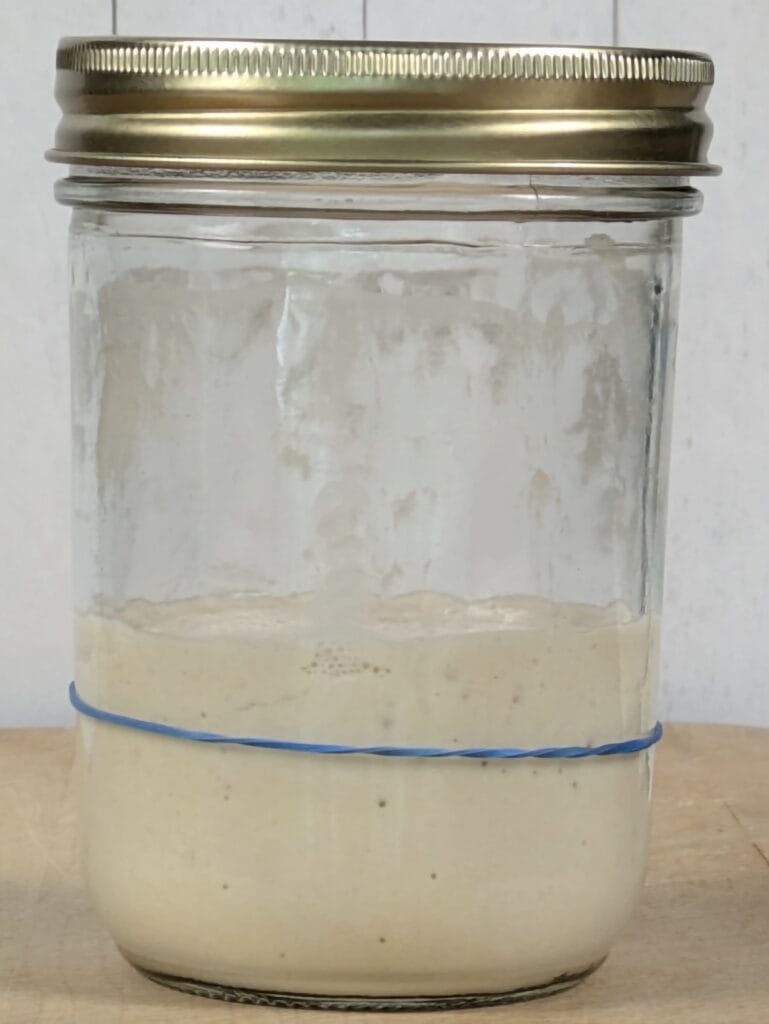 Cover the jar with a lid fitted loosely to allow air to escape as the wild yeast and bacteria produce carbon dioxide when it feeds on the mixture. Mark the begging level of the starter with a rubberband or marker. Store the jar at room temperature and stir the mixture a few times within this period until you notice it start to bubble and rise.